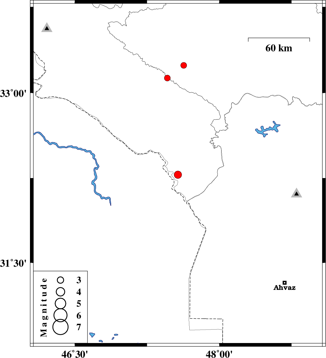 2004/12/14 | 14:17:07.8 | 17:47:07.8 | 33.13 | 47.46 | 42 | ML:2.8 | 14 km East of Darreh Shahr, Ilam Province | ||