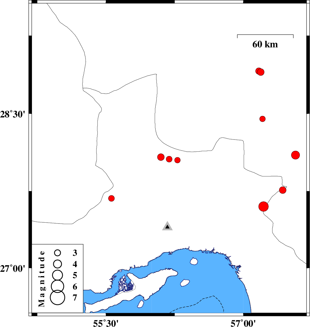 2004/12/17 | 06:26:44.9 | 09:56:44.9 | 28.08 | 56.1 | 41 | ML:3.4 | 31 km South-East of Hajiabad, Hormozgan Province | ||