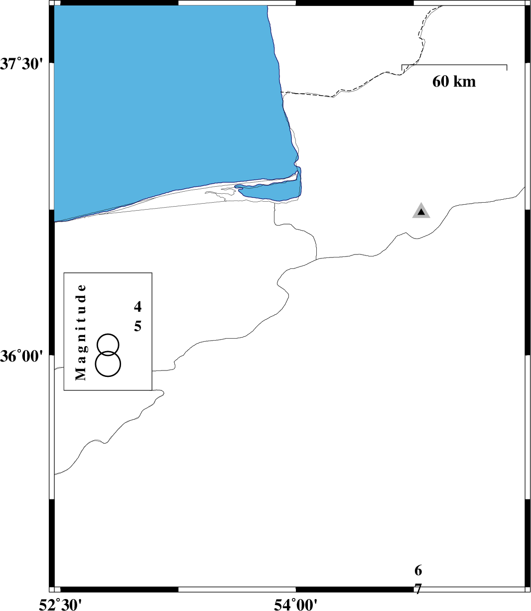 | 2004/12/21 | 02:19:30.3 | 05:49:30.3 | 36.29 | 53.96 | 14 | ML:3 | 37 km North-West of Damghan, Semnan Province | ||