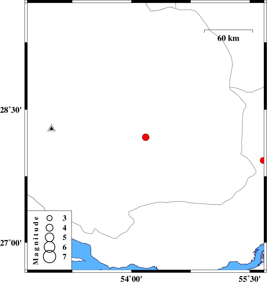 | 2004/12/24 | 06:07:39.1 | 09:37:39.1 | 27.93 | 55.67 | 15 | ML:3.5 | 47 km South-West of Hajiabad, Hormozgan Province |