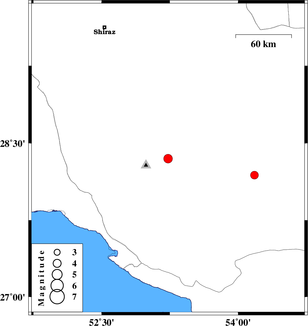 | 2004/12/28 | 20:30:13.2 | 00:00:13.2 | 28.19 | 54.18 | 14 | ML:4 | 58 km North-West of Lar, Fars Province |