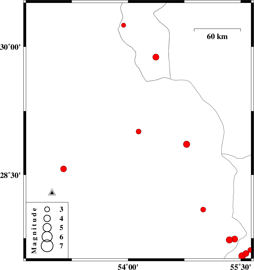 2006/04/07 | 22:02:46.2 | 01:32:46.2 | 28.86 | 54.78 | 17 | ML:4 | 26 km North-East of Darab, Fars Province | ||