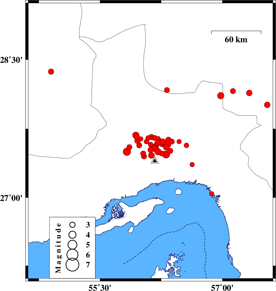 2006/04/02 | 13:46:37.3 | 17:16:37.3 | 27.57 | 56.3 | 14 | ML:2.7 | 42 km North of Bandar-e abbas, Hormozgan Province | ||