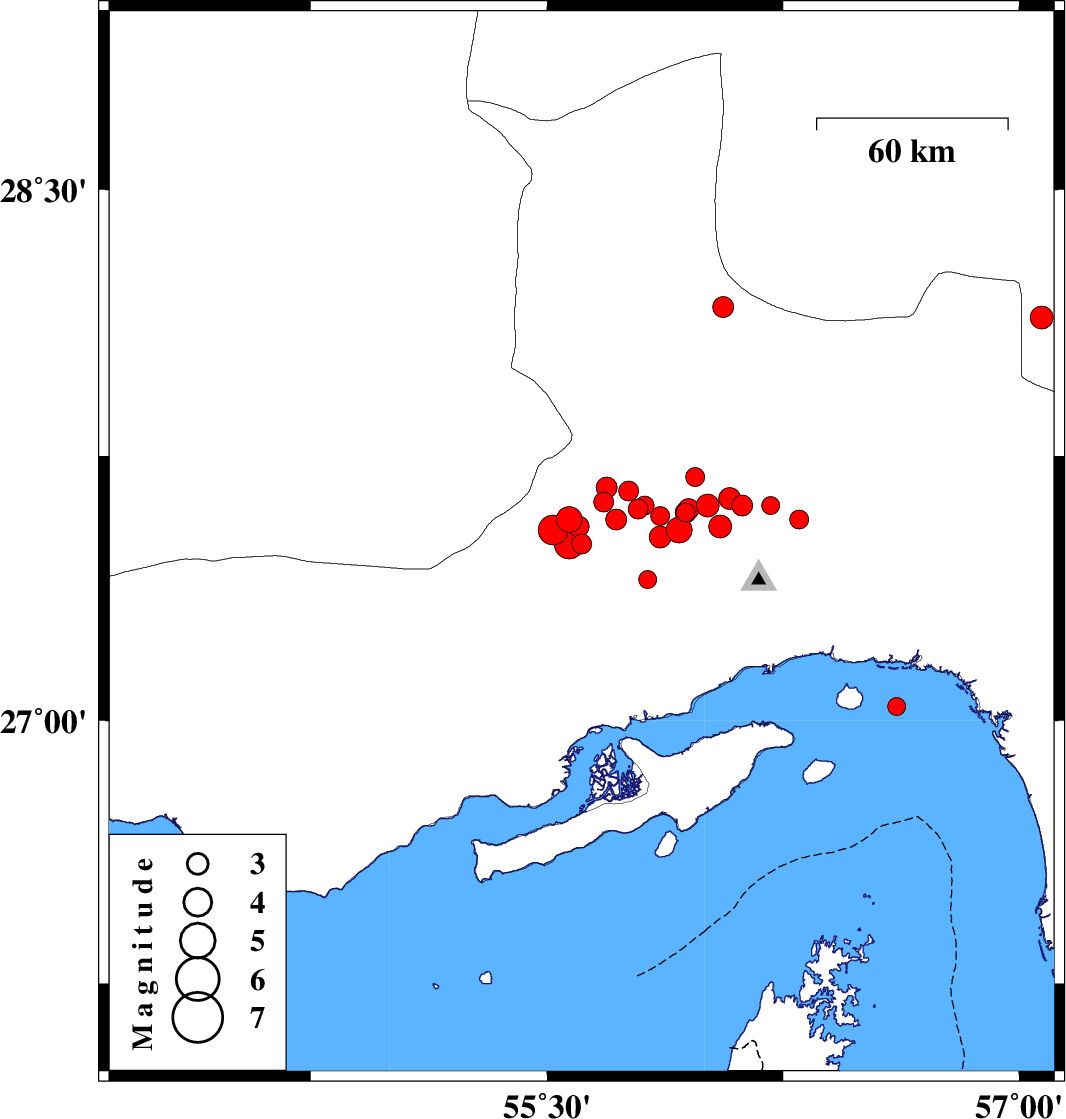 2006/04/04 | 10:27:09.5 | 13:57:09.5 | 27.54 | 55.92 | 14 | ML:3.7 | 53 km North-West of Bandar-e abbas, Hormozgan Province | ||