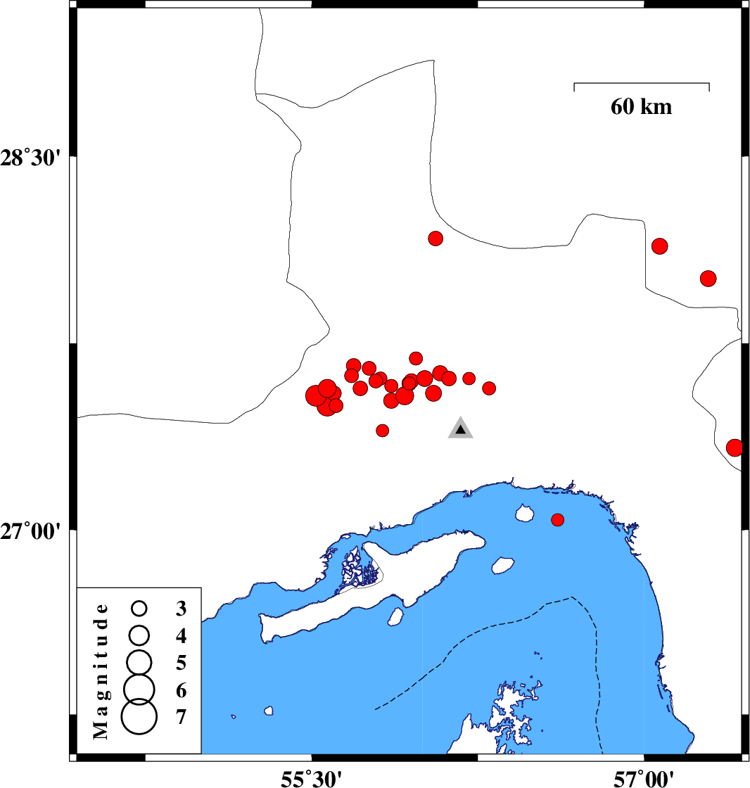 2006/04/04 | 10:27:09.5 | 13:57:09.5 | 27.54 | 55.92 | 14 | ML:3.7 | 53 km North-West of Bandar-e abbas, Hormozgan Province | ||