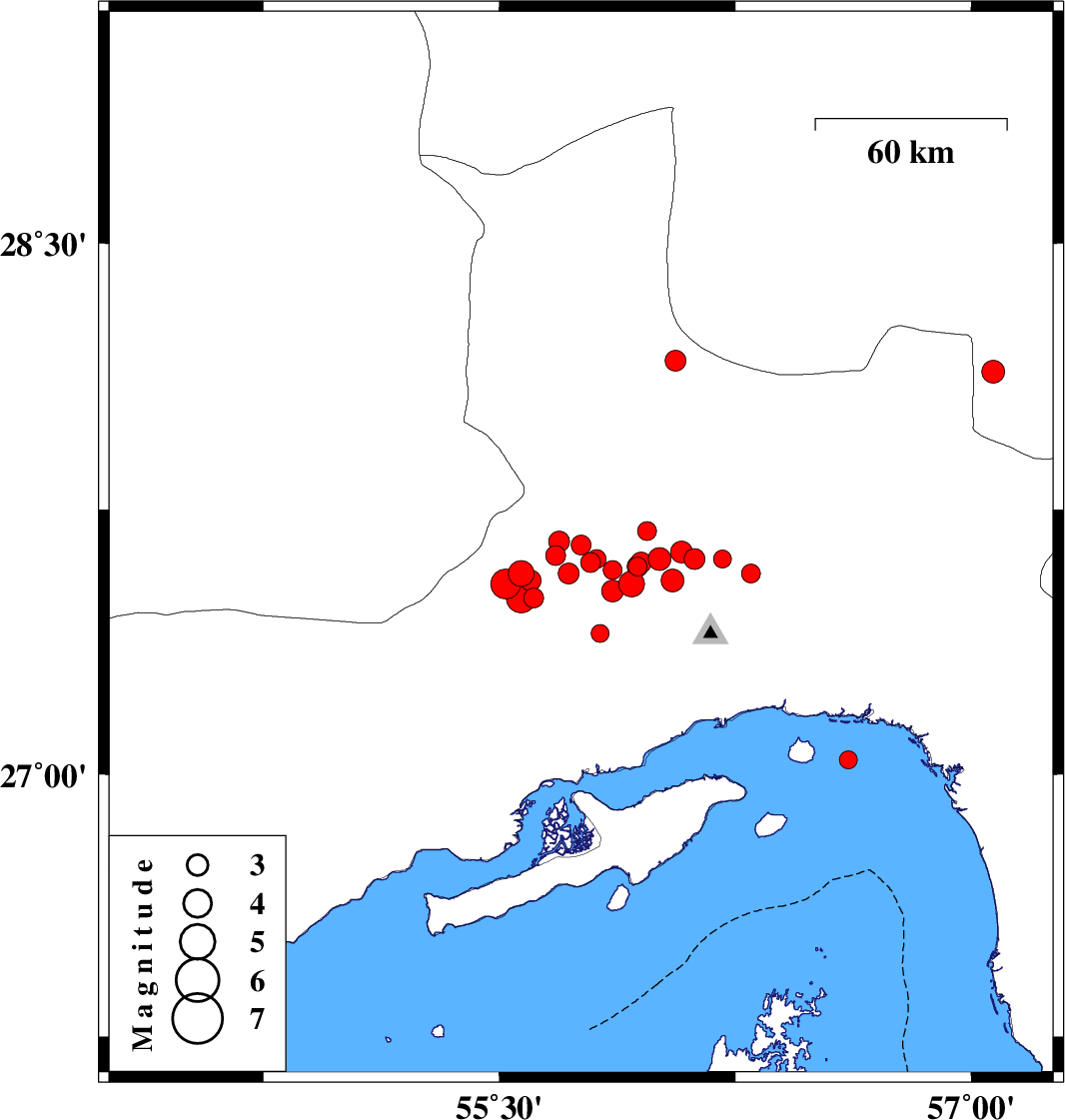 2006/04/04 | 10:27:09.5 | 13:57:09.5 | 27.54 | 55.92 | 14 | ML:3.7 | 53 km North-West of Bandar-e abbas, Hormozgan Province | ||