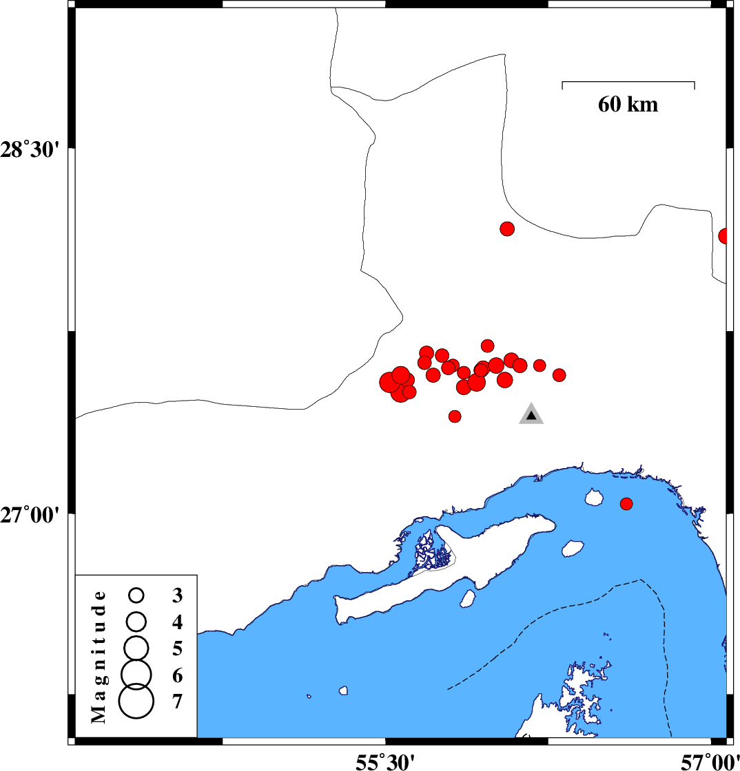 2006/04/04 | 10:27:09.5 | 13:57:09.5 | 27.54 | 55.92 | 14 | ML:3.7 | 53 km North-West of Bandar-e abbas, Hormozgan Province | ||
