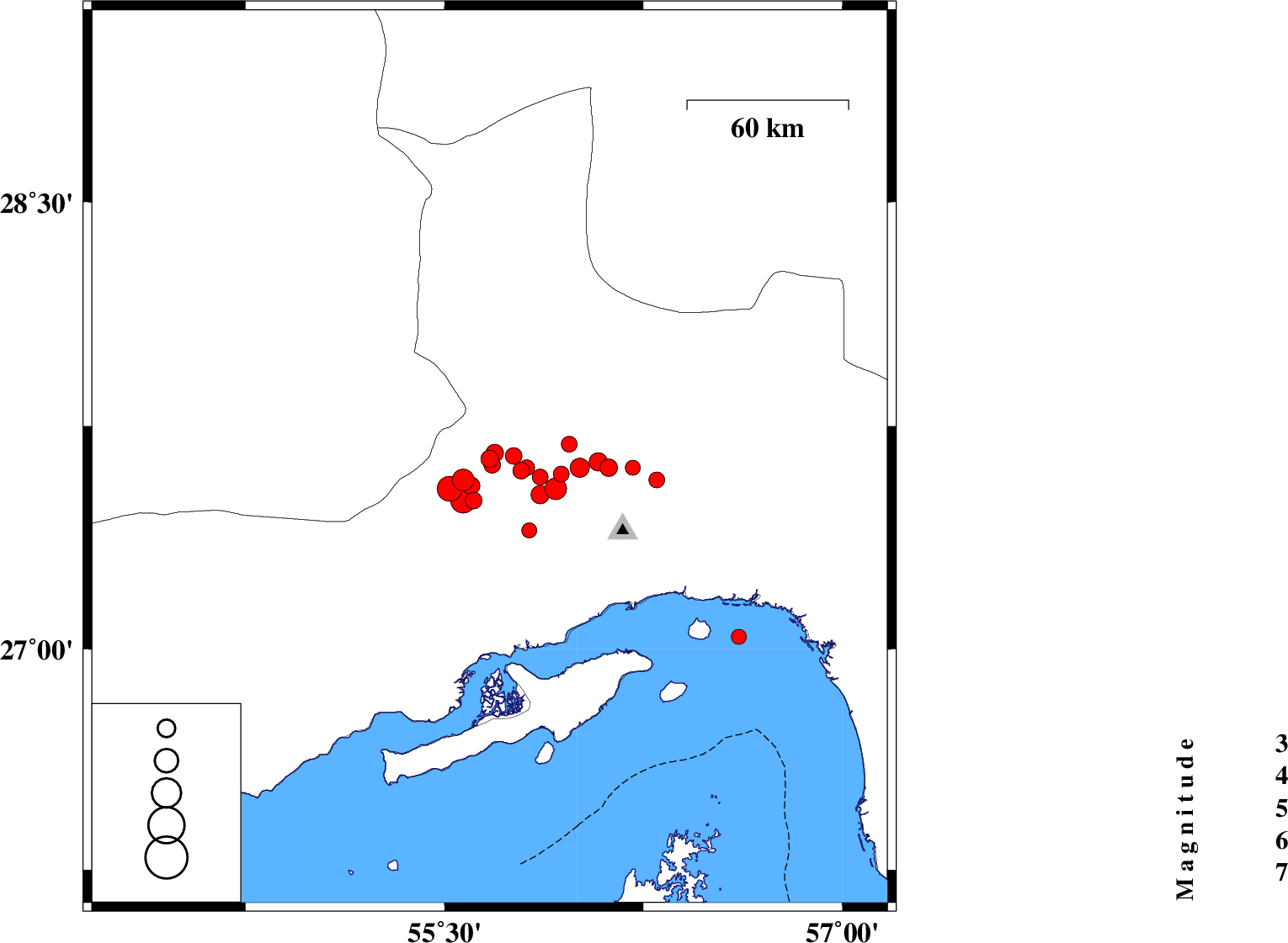 2006/04/04 | 10:27:09.5 | 13:57:09.5 | 27.54 | 55.92 | 14 | ML:3.7 | 53 km North-West of Bandar-e abbas, Hormozgan Province | ||