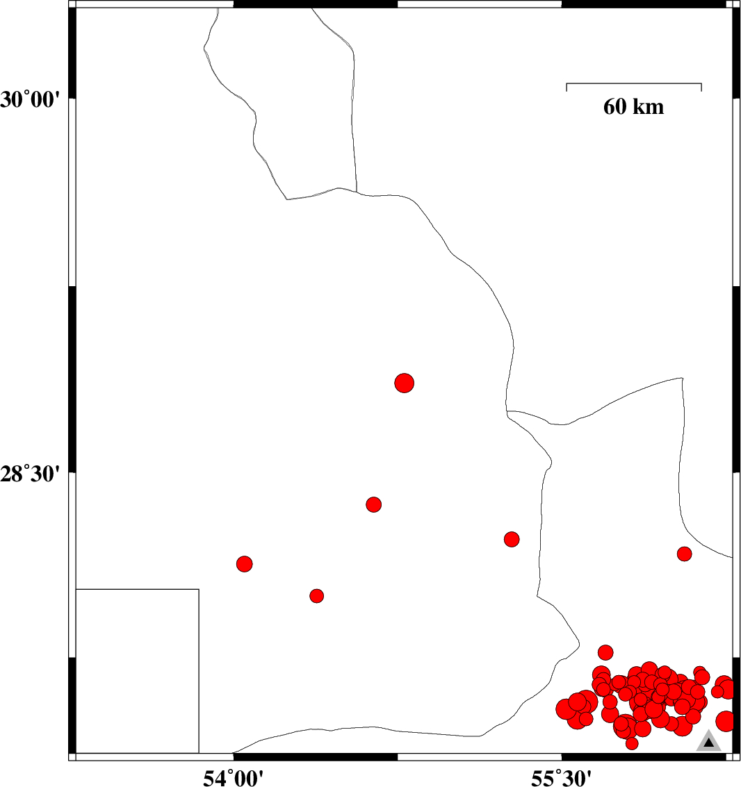2006/04/07 | 22:02:46.2 | 01:32:46.2 | 28.86 | 54.78 | 17 | ML:4 | 26 km North-East of Darab, Fars Province | ||