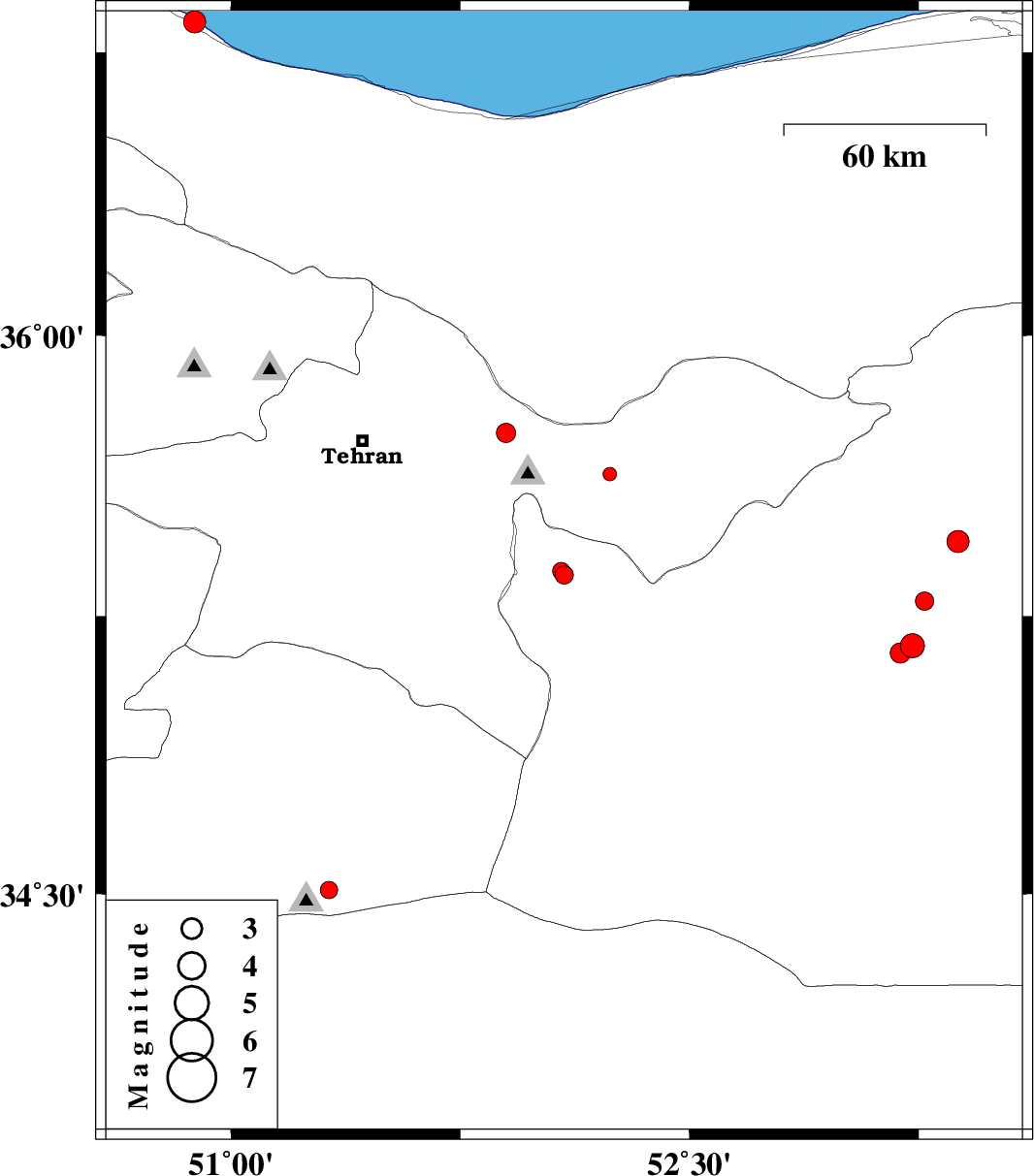 2006/05/08 | 10:01:52.0 | 13:31:52.0 | 35.36 | 52.09 | 14 | ML:2.7 | 27 km North-West of Garmsar, Semnan Province | ||
