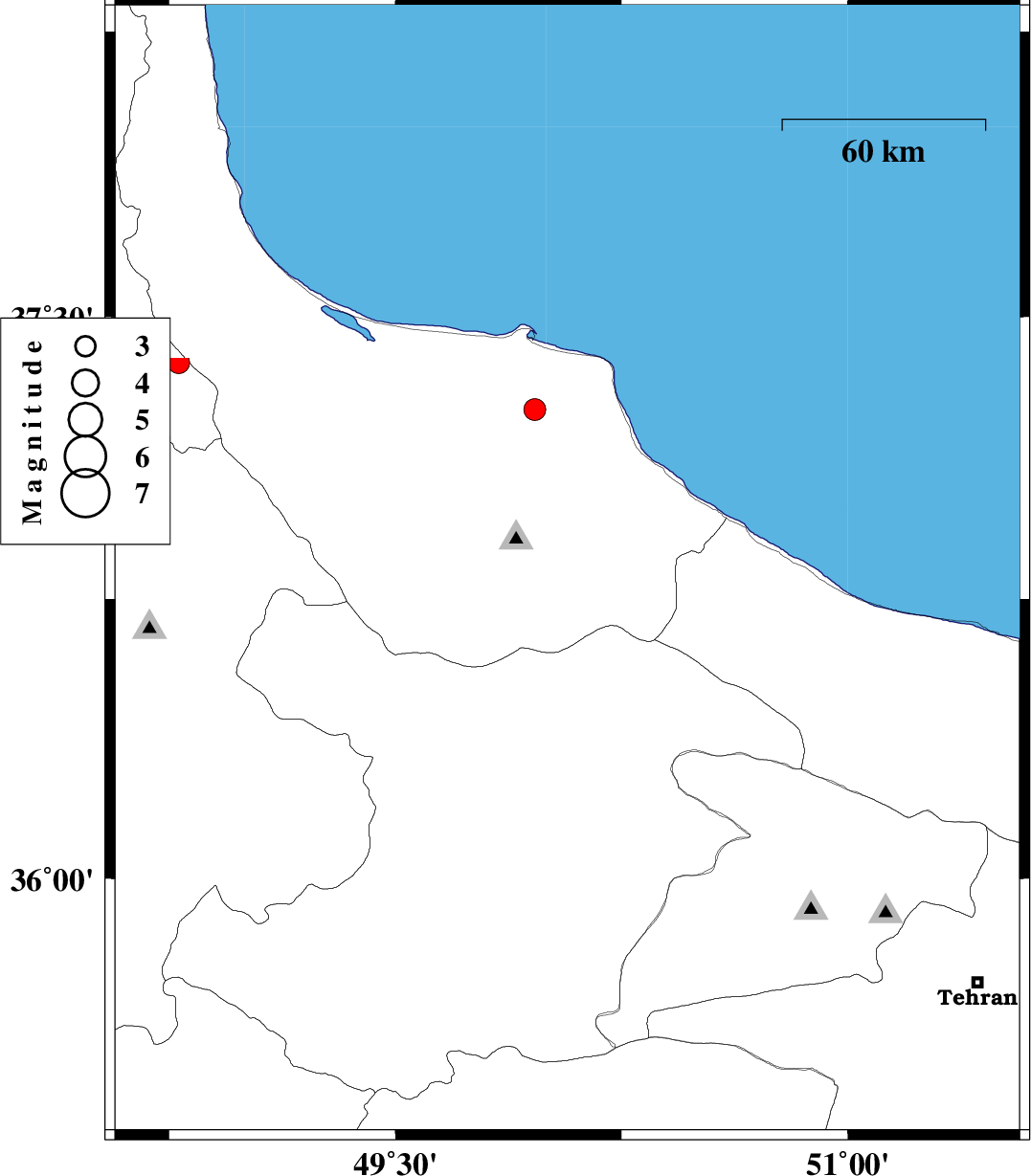| 2006/04/08 | 19:44:56.0 | 23:14:56.0 | 36.82 | 50.07 | 17 | ML:2.9 | 31 km South of Amlash, Gilan Province | ||