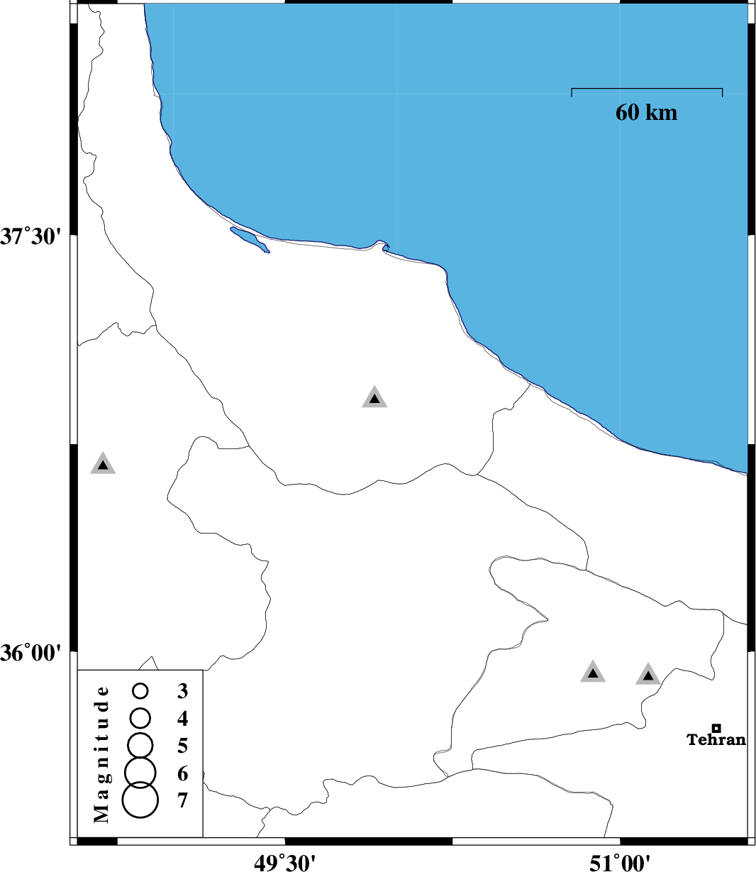 | 2006/04/08 | 19:44:56.0 | 23:14:56.0 | 36.82 | 50.07 | 17 | ML:2.9 | 31 km South of Amlash, Gilan Province |