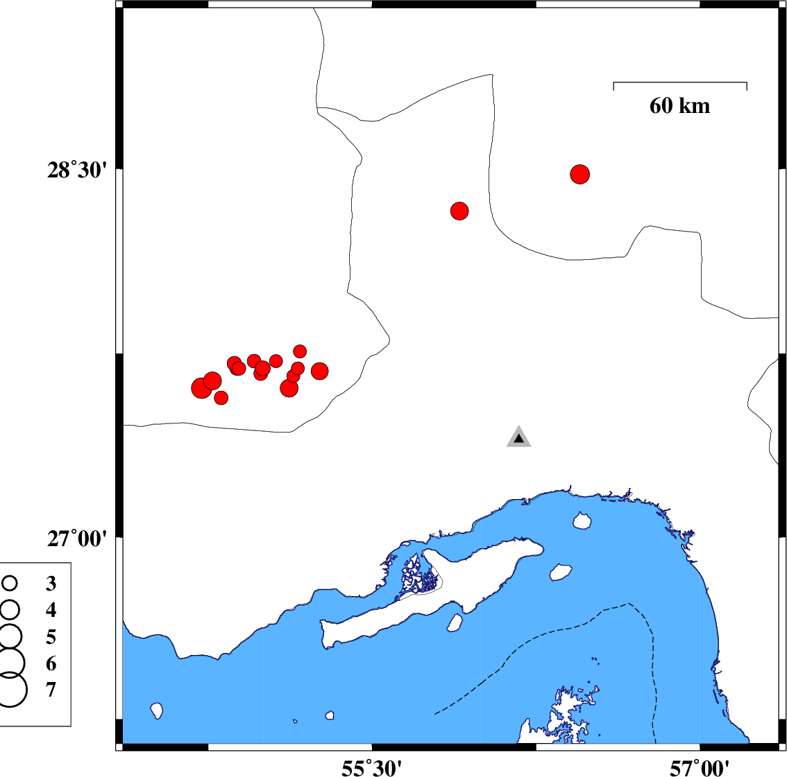 2006/04/04 | 10:27:09.5 | 13:57:09.5 | 27.54 | 55.92 | 14 | ML:3.7 | 53 km North-West of Bandar-e abbas, Hormozgan Province |