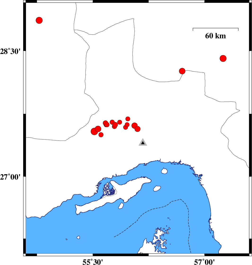 2006/04/05 | 13:13:48.8 | 16:43:48.8 | 27.5 | 55.61 | 15 | ML:2.8 | 75 km North-West of Bandar-e abbas, Hormozgan Province | ||