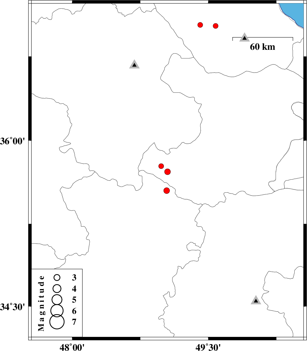 2006/04/25 | 16:50:04.6 | 20:20:04.6 | 35.77 | 48.98 | 14 | ML:2.5 | 42 km North of Razan, Hamedan Province |