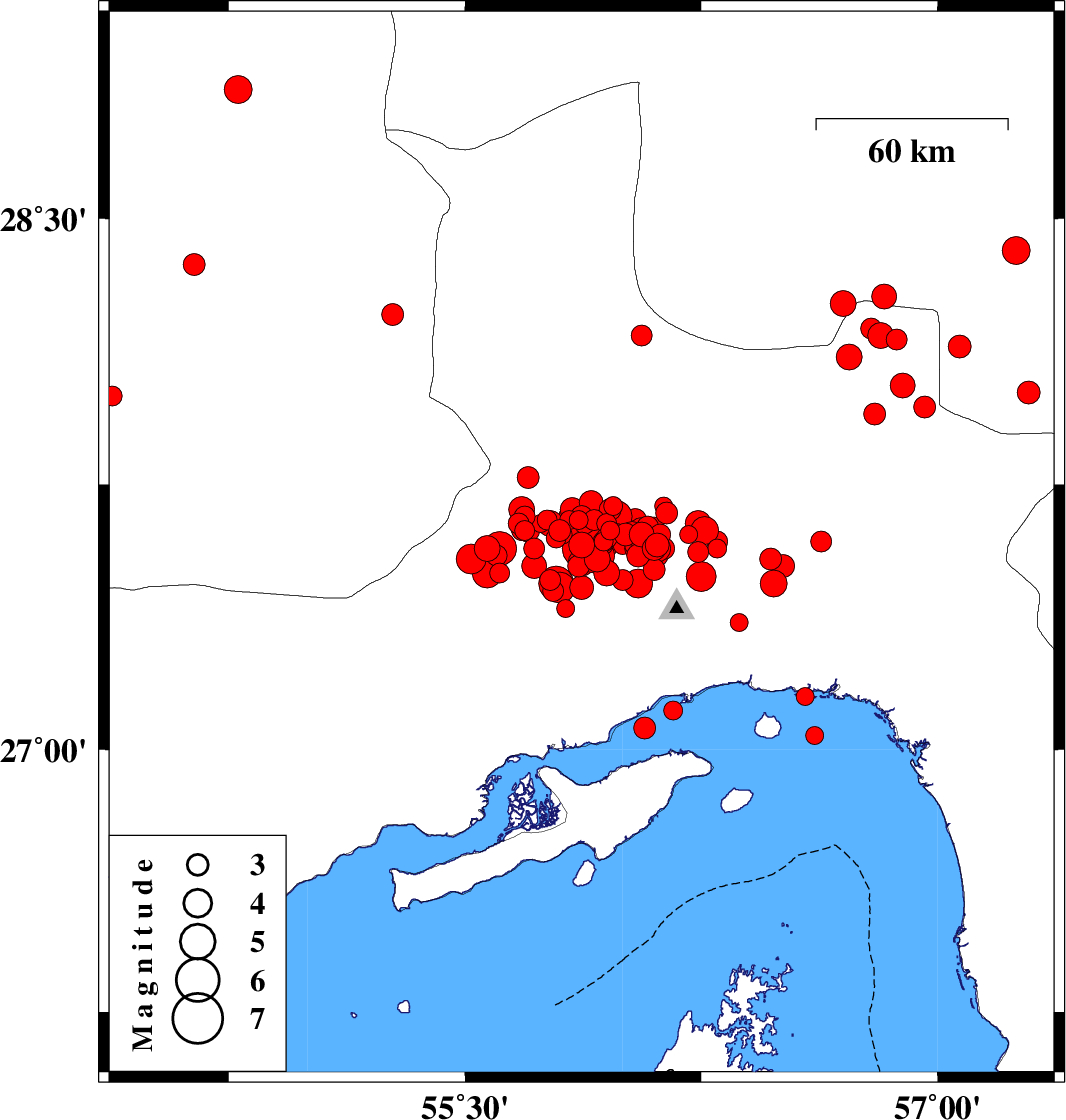 2006/04/02 | 08:41:59.6 | 12:11:59.6 | 27.61 | 55.81 | 14 | ML:2.7 | 66 km North-West of Bandar-e abbas, Hormozgan Province | ||