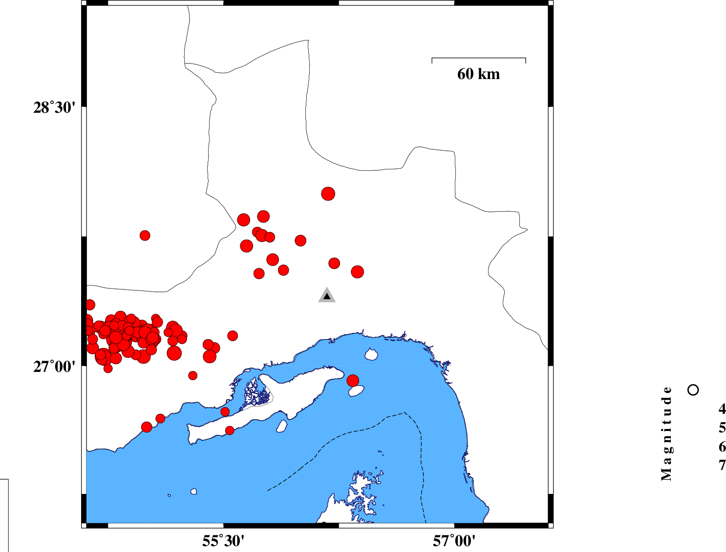 2006/04/04 | 10:27:09.5 | 13:57:09.5 | 27.54 | 55.92 | 14 | ML:3.7 | 53 km North-West of Bandar-e abbas, Hormozgan Province | ||