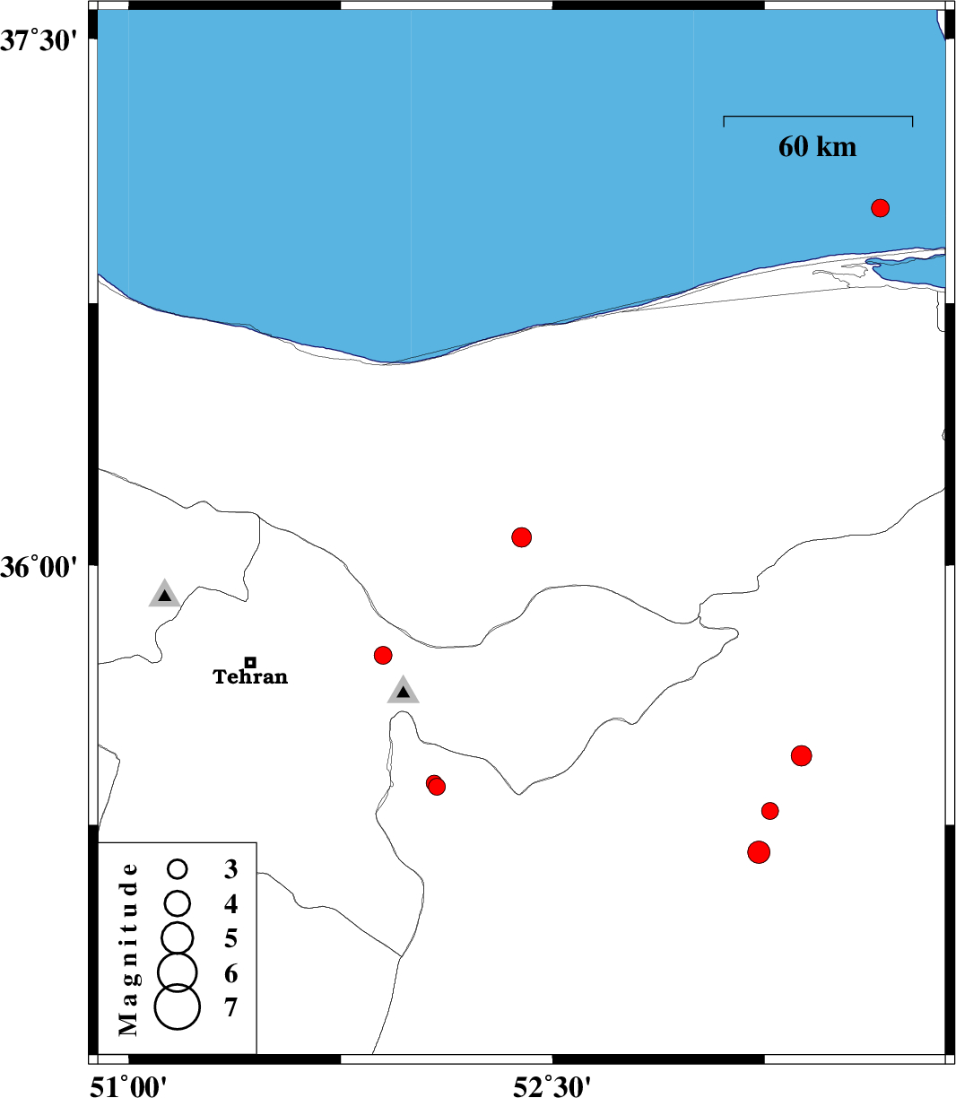 2006/05/11 | 22:48:17.9 | 02:18:17.9 | 37.02 | 53.66 | 15 | ML:2.8 | Caspian Sea, 37 km North-East of Behshahr | ||