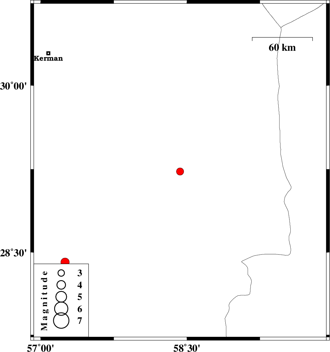 2006/04/07 | 12:37:21.7 | 16:07:21.7 | 28.41 | 57.25 | 34 | ML:3.9 | 55 km South-West of Jiroft, Kerman Province |