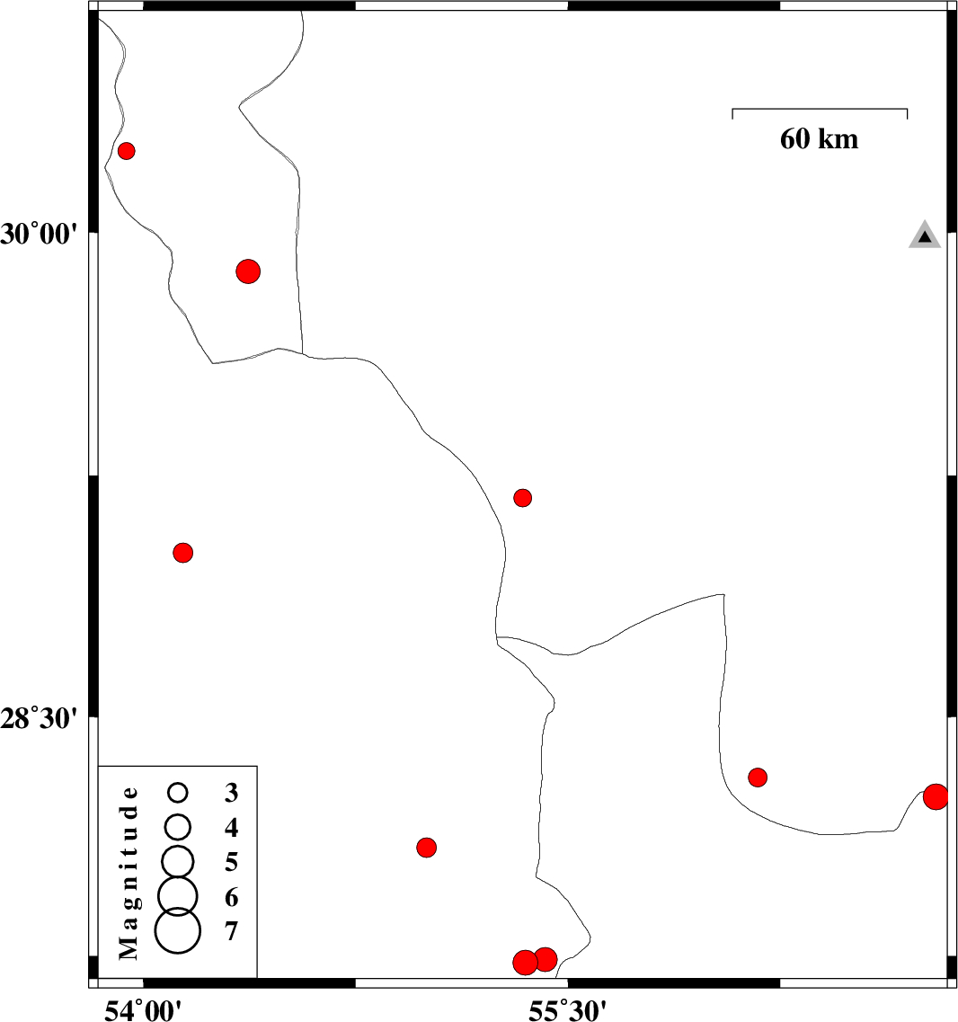 2006/05/13 | 00:13:08.9 | 03:43:08.9 | 28.18 | 53.99 | 14 | ML:3 | 55 km South-East of Jahrom, Fars Province | ||