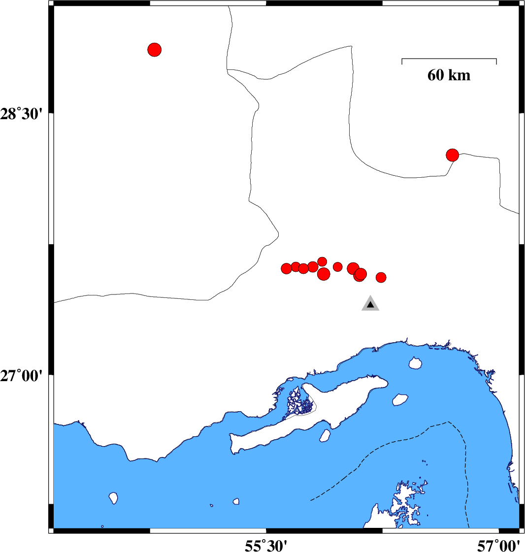 2006/04/07 12:48:05.0 16:18:05.0 27.6255.9614 ML:2.7 58 km North-West of Bandar-e abbas, Hormozgan Province