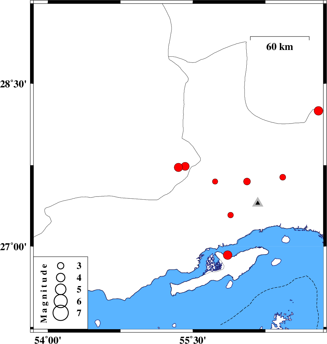 2006/04/19 | 10:03:25.2 | 13:33:25.2 | 27.29 | 55.89 | 14 | ML:2.7 | 40 km North-West of Bandar-e abbas, Hormozgan Province |