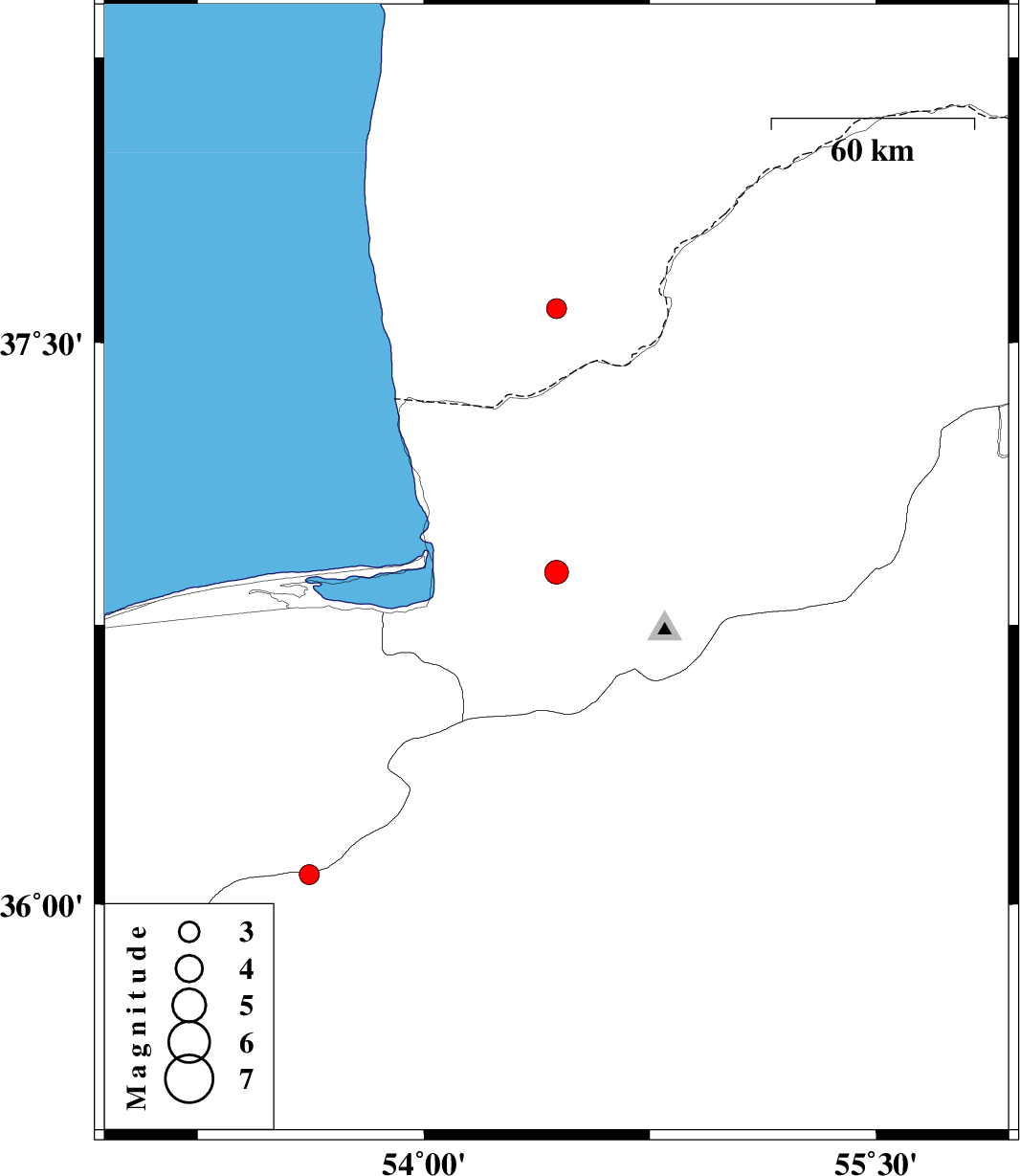| 2006/04/24 | 19:11:21.1 | 22:41:21.1 | 36.89 | 54.44 | 14 | ML:3.5 | 5 km Gorgan, Golestan Province | ||