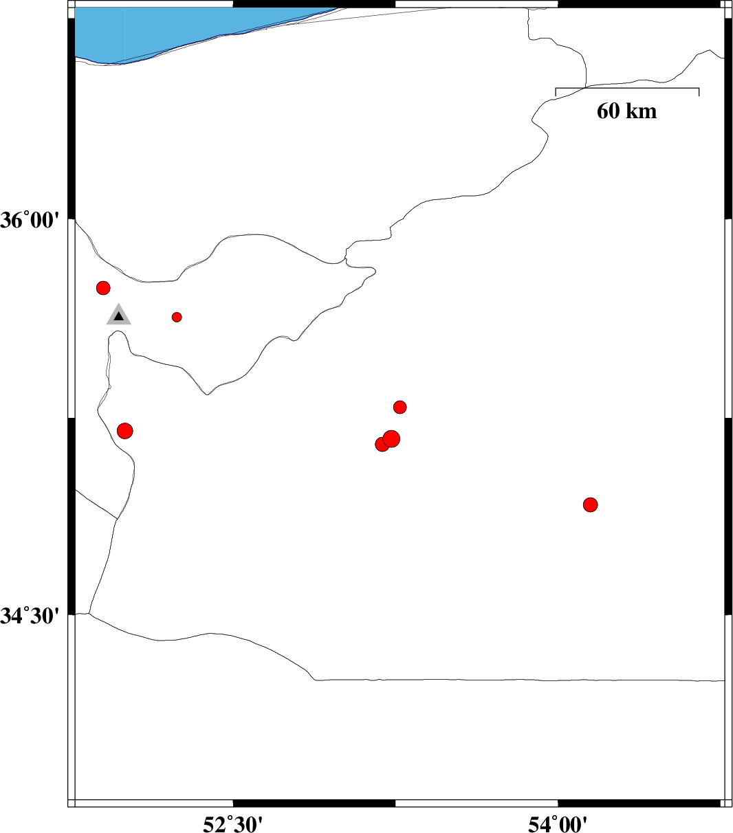 | 2006/04/03 | 00:38:05.0 | 04:08:05.0 | 35.2 | 52 | 14 | ML:3.3 | 30 km West of Garmsar, Semnan Province |