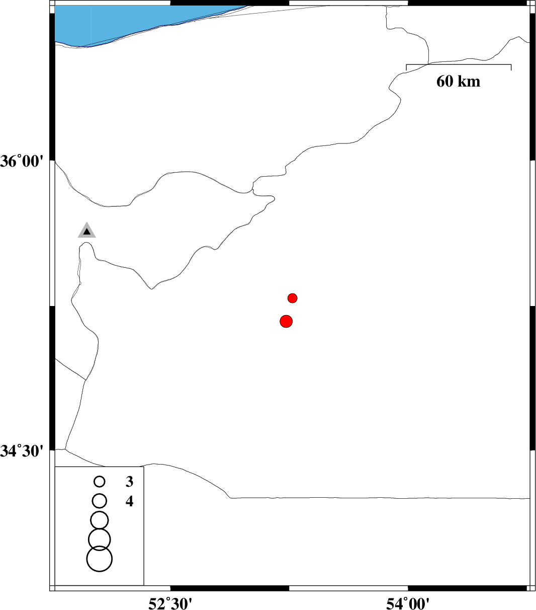 | 2006/04/29 | 09:46:16.3 | 13:16:16.3 | 35.17 | 53.23 | 14 | ML:3.5 | 46 km South-West of Semnan, Semnan Province |
