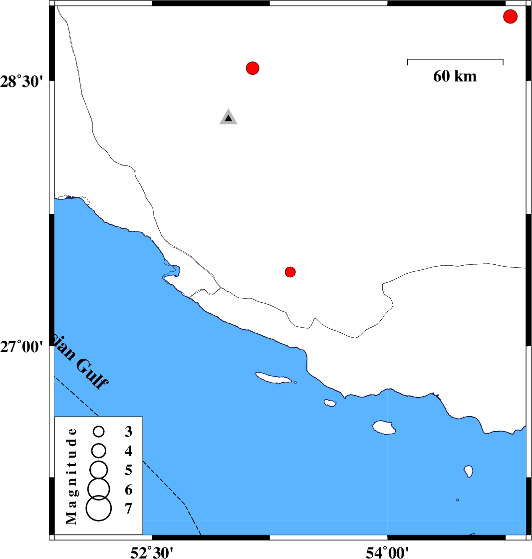 2006/04/07 | 22:02:46.2 | 01:32:46.2 | 28.86 | 54.78 | 17 | ML:4 | 26 km North-East of Darab, Fars Province |