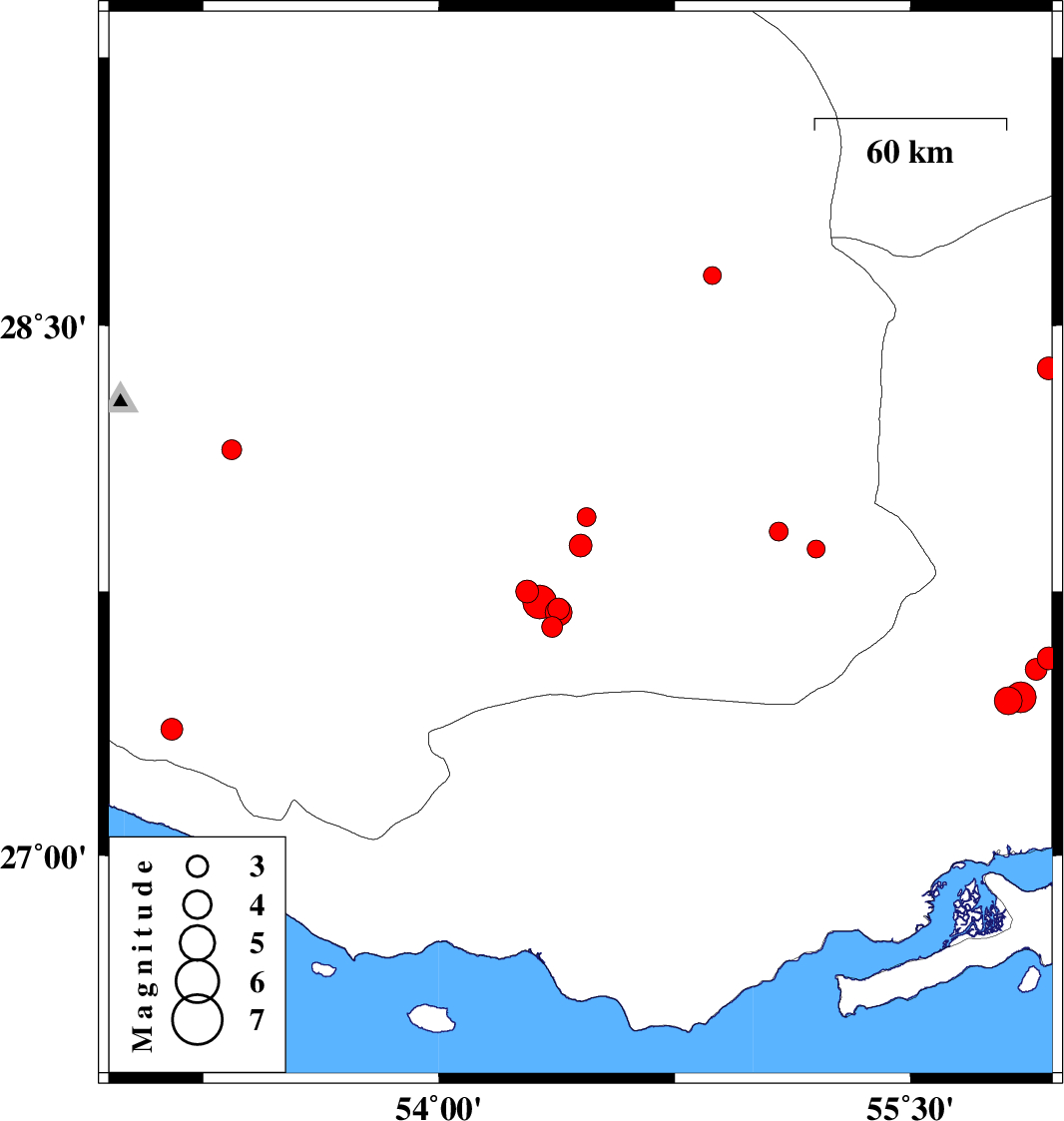 2006/08/23 | 09:06:56.5 | 12:36:56.5 | 27.44 | 55.81 | 15 | ML:3.9 | 54 km North-West of Bandar-e abbas, Hormozgan Province | ||