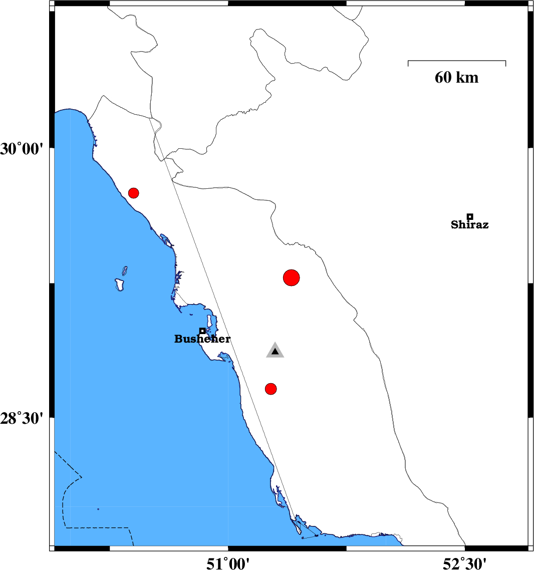 | 2006/09/14 | 02:25:33.8 | 05:55:33.8 | 29.28 | 51.4 | 38 | ML:4.6 | 19 km East of Borazjan, Bushehr Province | ||