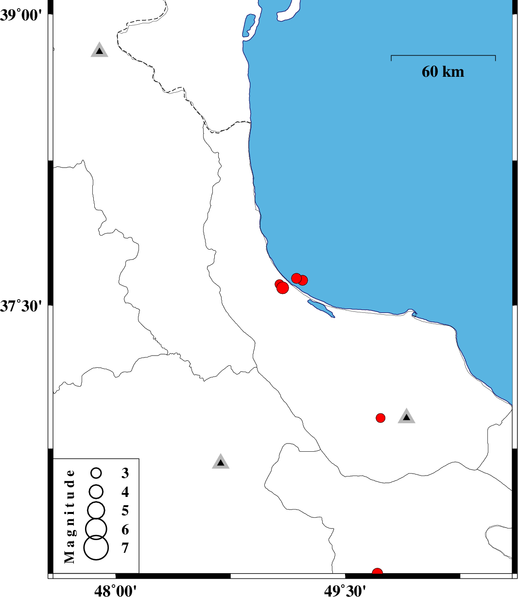 2006/08/25 | 15:16:37.6 | 18:46:37.6 | 37.64 | 49.18 | 14 | ML:2.9 | Caspian Sea, 10 km Rezvanshahr | ||