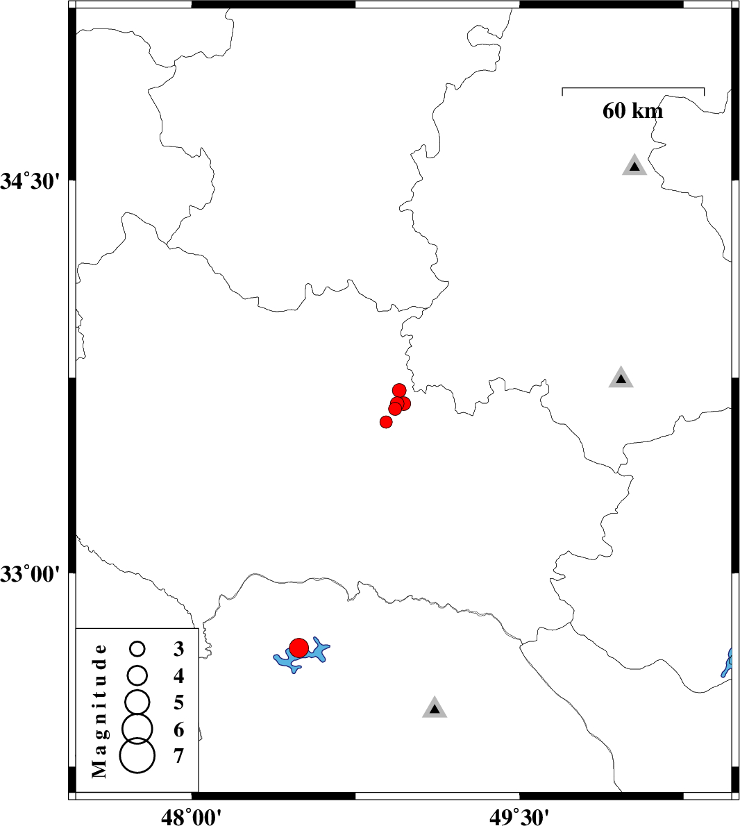 | 2006/09/16 | 22:20:29.2 | 01:50:29.2 | 33.58 | 48.89 | 15 | ML:2.5 | 20 km West of Dorud, Lorestan Province | ||