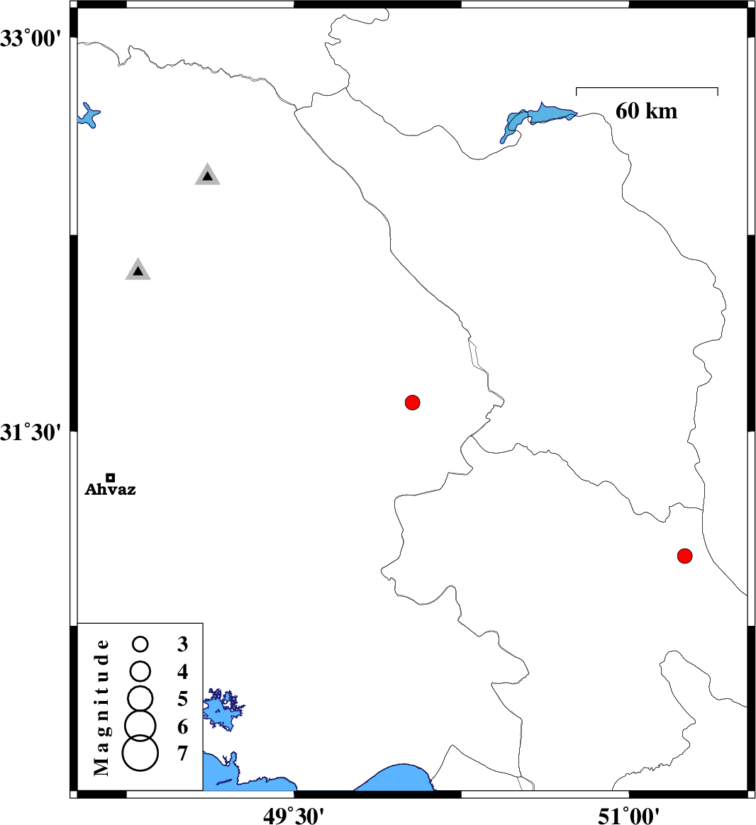 | 2006/09/21 | 05:32:26.2 | 09:02:26.2 | 31.61 | 50.03 | 16 | ML:2.9 | 15 km East of Bagh Malek, Khoozestan Province | ||