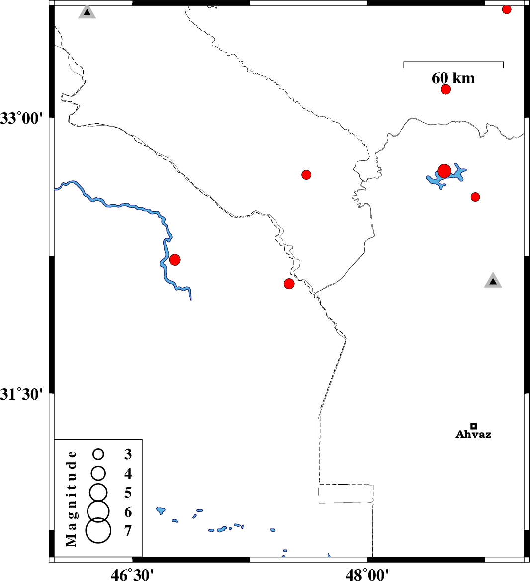 | 2006/09/21 | 08:14:15.2 | 11:44:15.2 | 32.1 | 47.5 | 36 | ML:3 | 69 km South-East of Dehloran, Ilam Province | ||