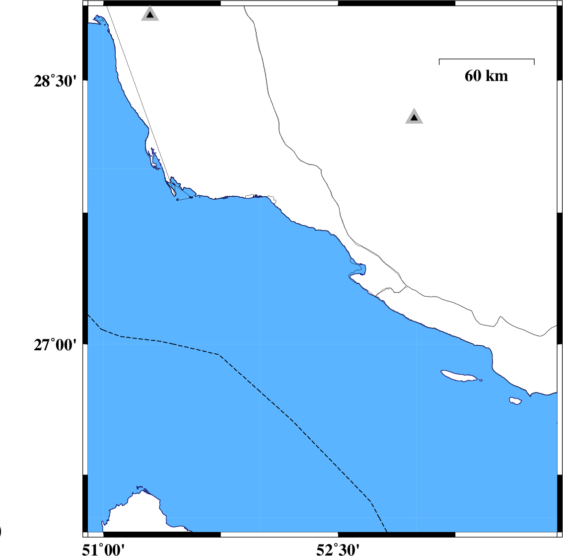 | 2006/09/23 | 10:27:05.5 | 13:57:05.5 | 27.35 | 52.39 | 14 | ML:3.5 | Persian Gulf, 53 km South-West of Mehr | ||