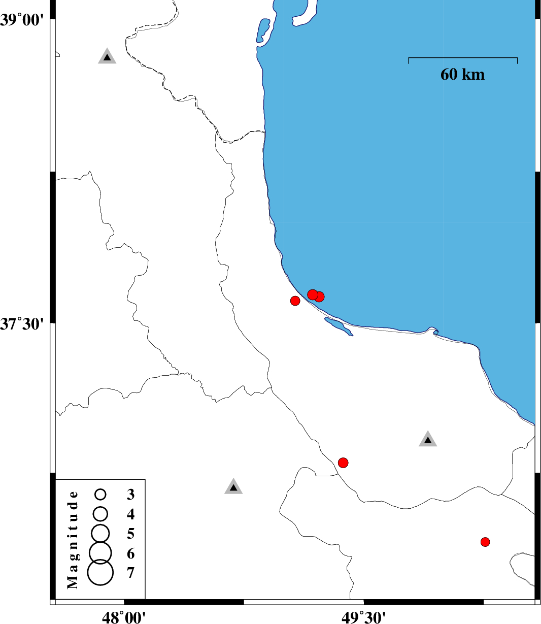 2006/08/25 | 11:41:36.5 | 15:11:36.5 | 37.63 | 49.22 | 17 | ML:3 | Caspian Sea, 11 km Rezvanshahr | ||