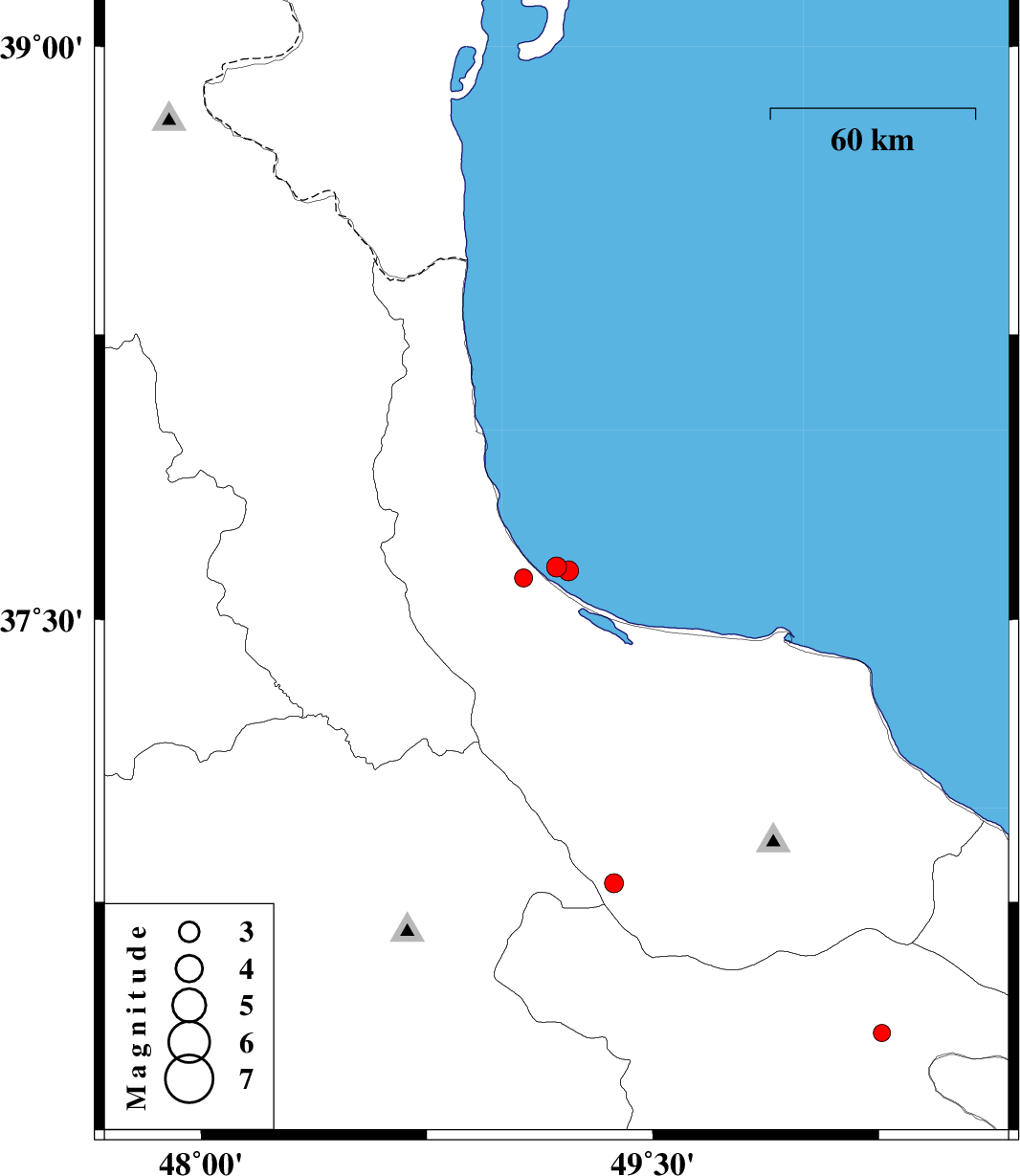 2006/08/25 | 15:16:37.6 | 18:46:37.6 | 37.64 | 49.18 | 14 | ML:2.9 | Caspian Sea, 10 km Rezvanshahr | ||