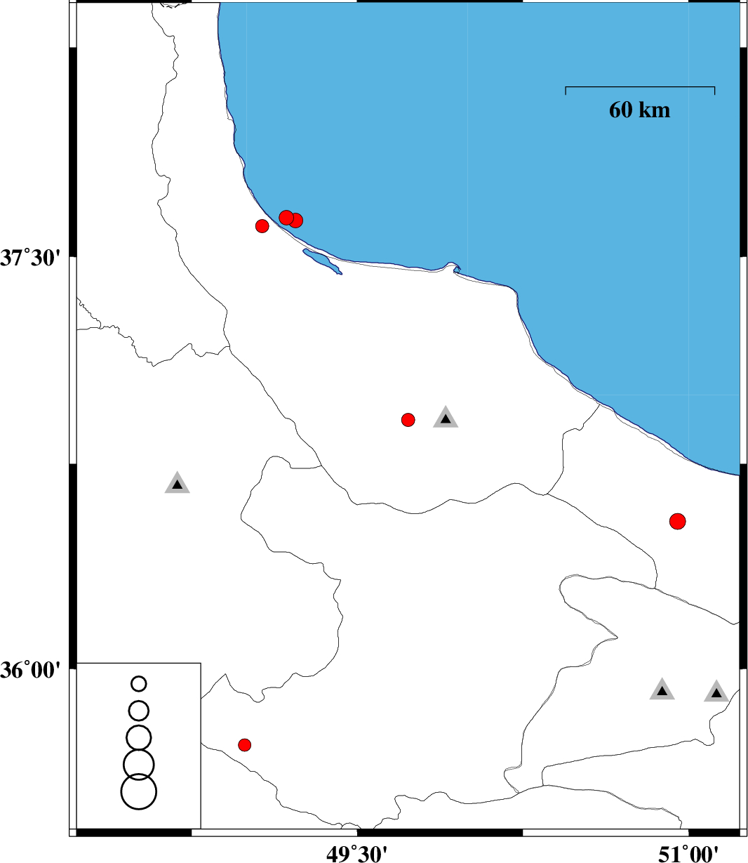 2006/08/25 | 15:16:37.6 | 18:46:37.6 | 37.64 | 49.18 | 14 | ML:2.9 | Caspian Sea, 10 km Rezvanshahr | ||