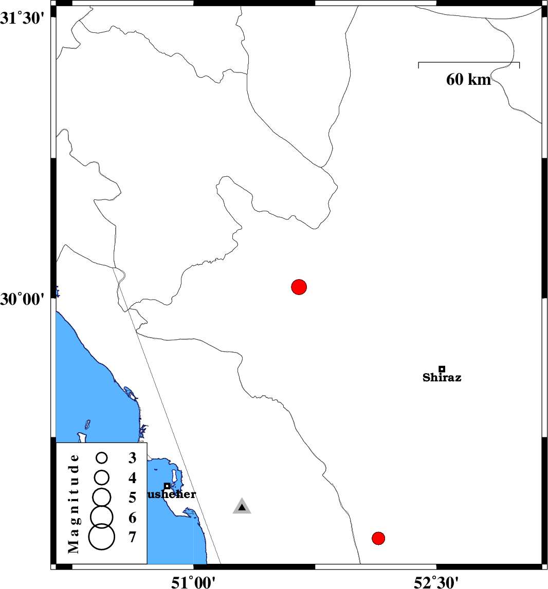 | 2006/09/29 | 15:18:31.5 | 18:48:31.5 | 30.06 | 51.65 | 15 | ML:4.2 | 13 km East of Nurabad, Fars Province | ||
