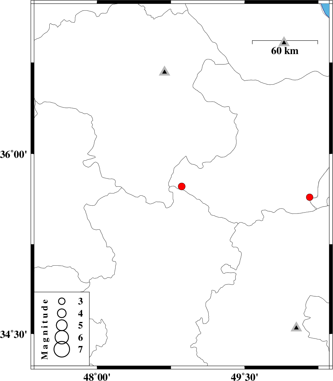 2006/10/25 | 01:02:18.1 | 04:32:18.1 | 35.73 | 48.86 | 14 | ML:3.3 | 41 km North-West of Razan, Hamedan Province | ||