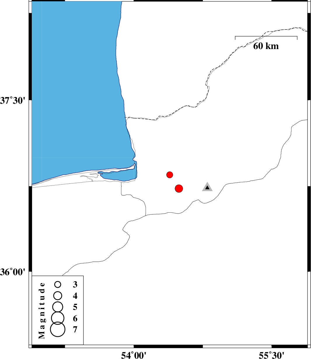2006/11/02 | 00:58:01.5 | 04:28:01.5 | 36.73 | 54.49 | 16 | ML:3.8 | 12 km South of Gorgan, Golestan Province | ||