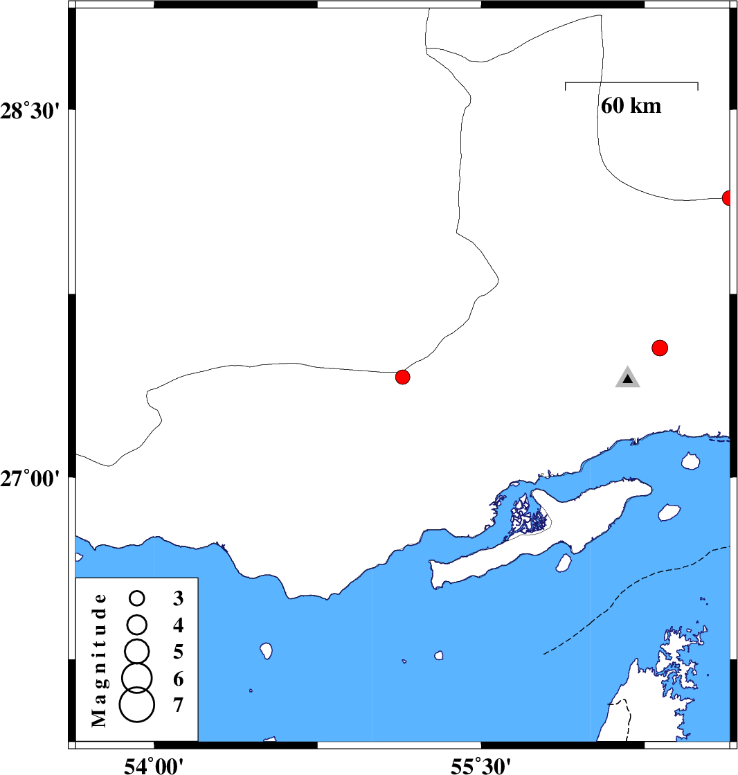 | 2006/10/30 | 02:23:54.8 | 05:53:54.8 | 27.53 | 56.32 | 26 | ML:3.2 | 38 km North of Bandar-e abbas, Hormozgan Province | ||