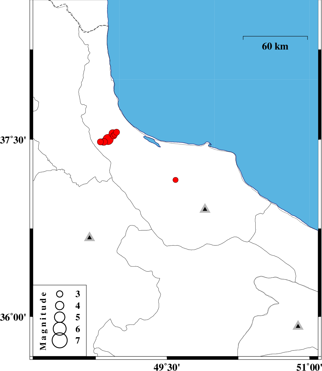2006/11/06 | 12:12:13.4 | 15:42:13.4 | 37.56 | 48.97 | 14 | ML:2.9 | 16 km West of Rezvanshahr, Gilan Province | ||