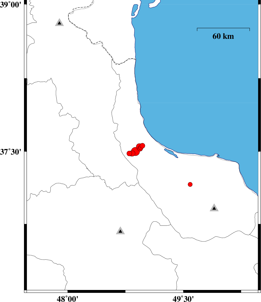 2006/11/05 | 21:35:17.9 | 01:05:17.9 | 37.48 | 48.83 | 14 | ML:3.2 | 29 km West of Rezvanshahr, Gilan Province | ||