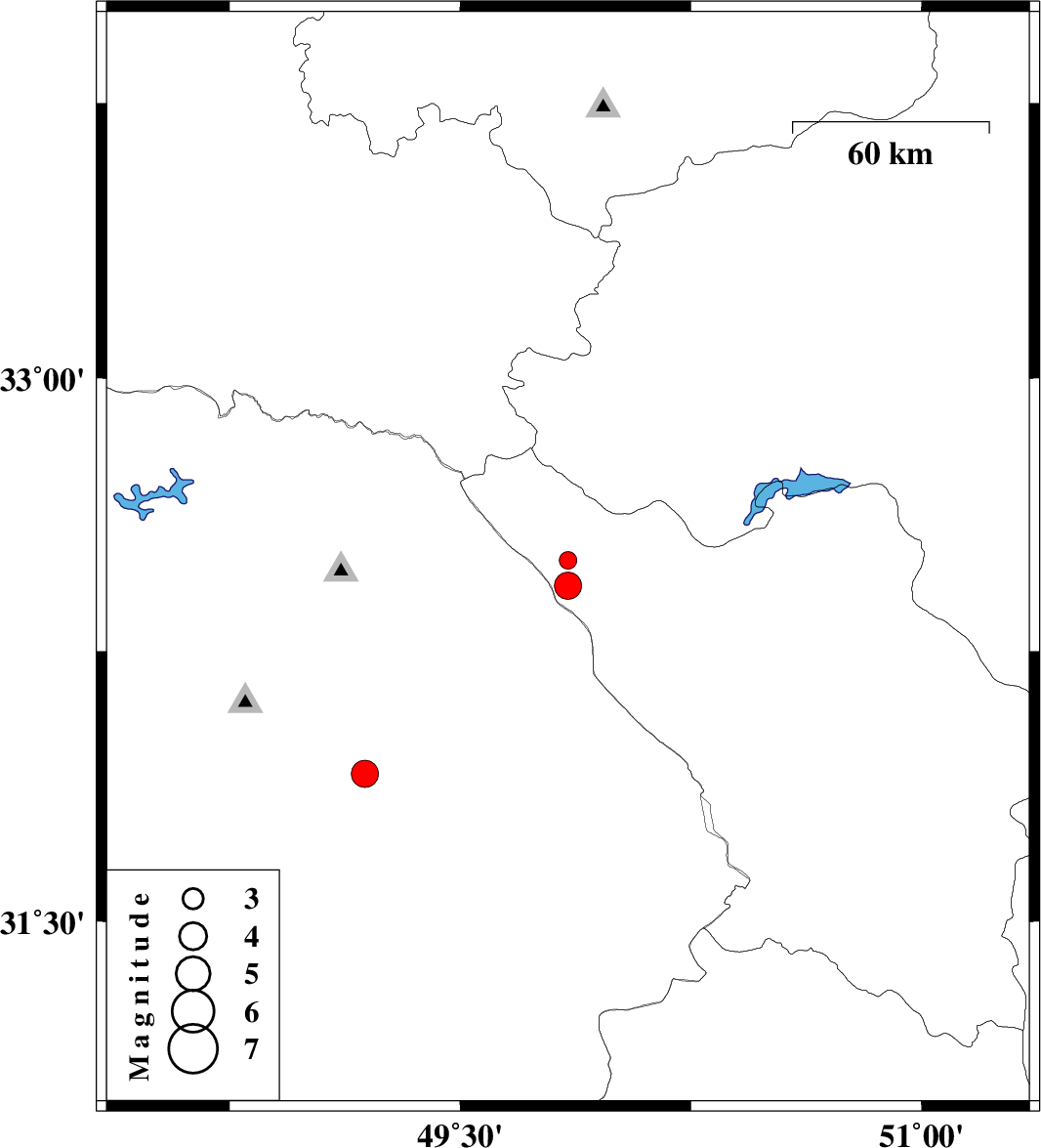 | 2006/11/07 | 08:52:21.4 | 12:22:21.4 | 31.91 | 49.19 | 16 | ML:4 | 11 km West of Masjed Soleyman, Khoozestan Province |