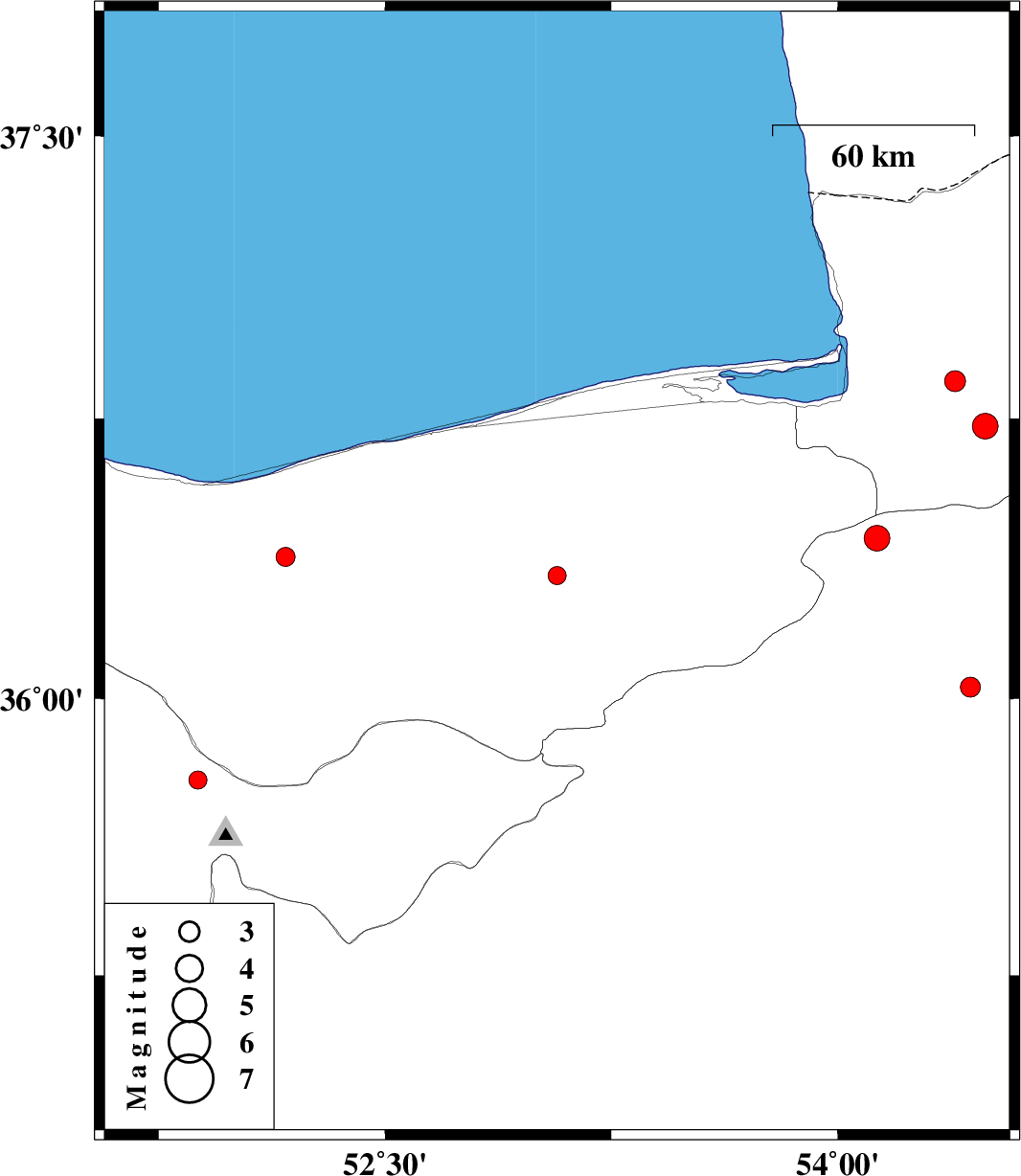 2006/11/12 | 17:22:01.8 | 20:52:01.8 | 36.03 | 54.44 | 14 | ML:3 | 17 km South of Damghan, Semnan Province | ||
