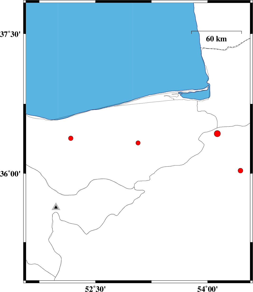 | 2006/11/08 | 18:23:31.1 | 21:53:31.1 | 36.38 | 52.17 | 6 | ML:2.8 | 19 km West of Amol, Mazandaran Province |