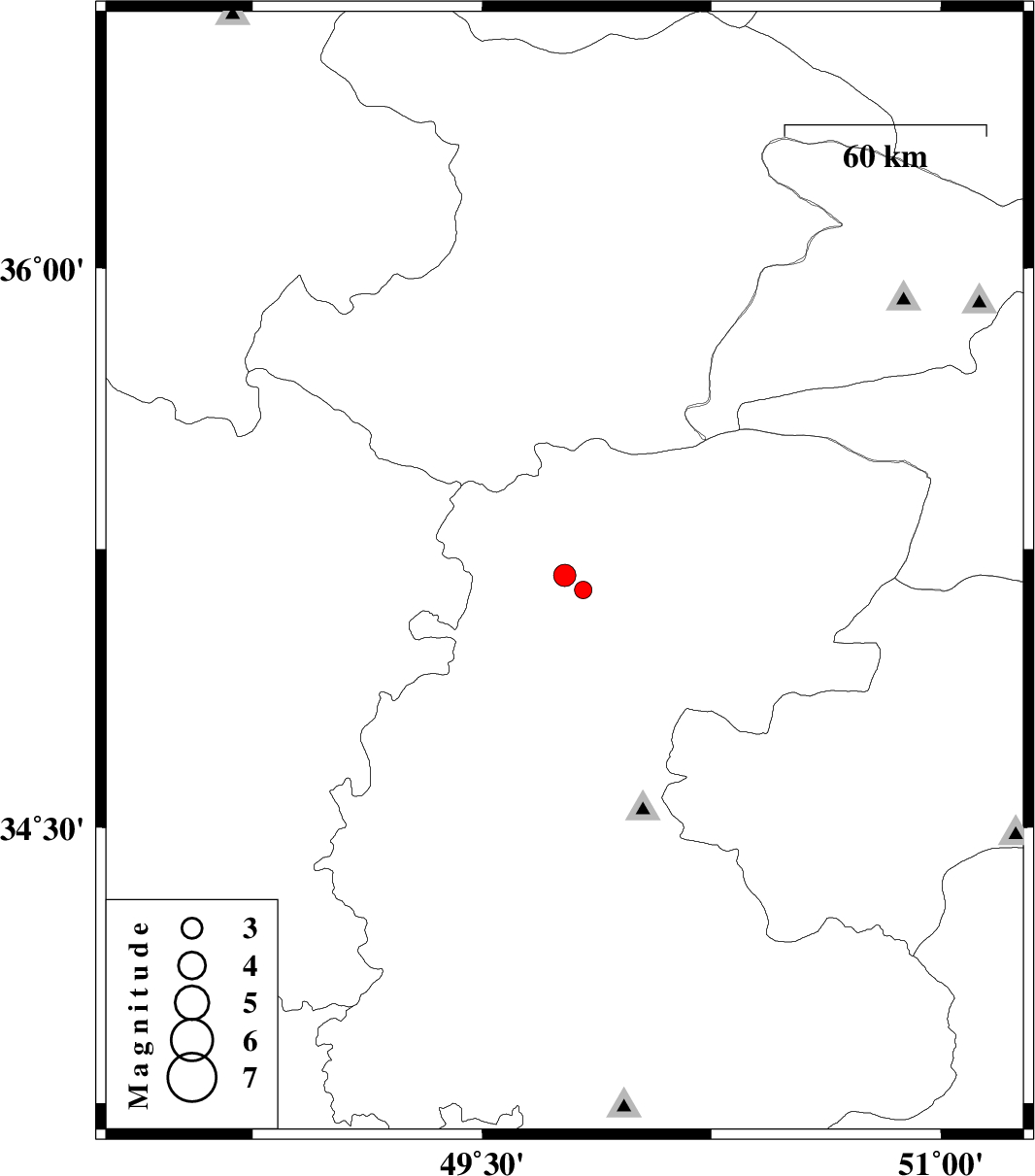 | 2006/11/12 | 09:51:40.4 | 13:21:40.4 | 35.14 | 49.83 | 21 | ML:2.6 | 50 km North-West of Saveh, Markazi Province |
